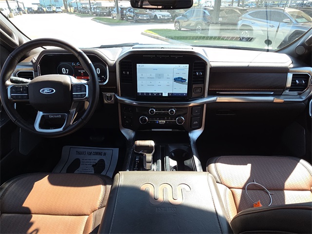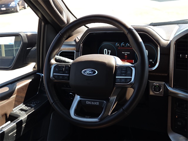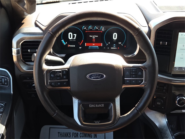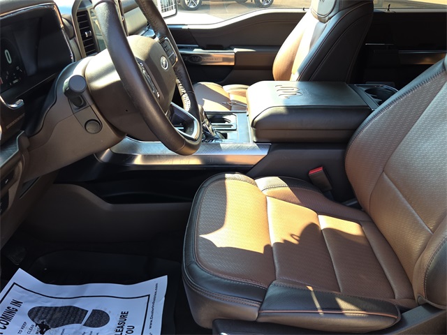 CARFAX One-Owner. Priced below KBB Fair Purchase Price! F-150 King Ranch, 3.5L V6 EcoBoost, 10-Speed Automatic, 4WD, Java Leather, Adaptive Steering, Adjustable pedals, Auto High-beam Headlights, Auto tilt-away steering wheel, Auto-dimming door mirrors, Auto-dimming Rear-View mirror, Brake assist, Delay-off headlights, Electronic Stability Control, Emergency communication system: SYNC 4 911 Assist, Equipment Group 600A Standard, Exterior Parking Camera Rear, Front anti-roll bar, Front reading lights, Garage door transmitter, Genuine wood dashboard insert, Genuine wood door panel insert, Heated front seats, Heated rear seats, King Ranch Leather Bucket Seats, Occupant sensing airbag, Radio: B&O Sound System by Bang & Olufsen, Remote keyless entry, SYNC 4 w/Enhanced Voice Recognition. This vehicle comes well equipped with Equipment Group 600A Standard, F-150 King Ranch, 3.5L V6 EcoBoost, 10-Speed Automatic, 4WD, Java Leather, Adaptive Steering, Adjustable pedals, Auto High-beam Headlights, Auto tilt-away steering wheel, Auto-dimming door mirrors, Auto-dimming Rear-View mirror, Brake assist, Delay-off headlights, Electronic Stability Control, Emergency communication system: SYNC 4 911 Assist, Exterior Parking Camera Rear, Front anti-roll bar, Front reading lights, Garage door transmitter, Genuine wood dashboard insert, Genuine wood door panel insert, Heated front seats, Heated rear seats, King Ranch Leather Bucket Seats, Occupant sensing airbag, Radio: B&O Sound System by Bang & Olufsen, Remote keyless entry, and SYNC 4 w/Enhanced Voice Recognition Equipment Group 600A Standard, F-150 King Ranch, 3.5L V6 EcoBoost, 10-Speed Automatic, 4WD, Java Leather, Adaptive Steering, Adjustable pedals, Auto High-beam Headlights, Auto tilt-away steering wheel, Auto-dimming door mirrors, Auto-dimming Rear-View mirror, Brake assist, Delay-off headlights, Electronic Stability Control, Emergency communication system: SYNC 4 911 Assist, Exterior Parking Camera Rear, Front anti-roll bar, Front reading lights, Garage door transmitter, Genuine wood dashboard insert, Genuine wood door panel insert, Heated front seats, Heated rear seats, King Ranch Leather Bucket Seats, Occupant sensing airbag, Radio: B&O Sound System by Bang & Olufsen, Remote keyless entry, SYNC 4 w/Enhanced Voice Recognition, 18" Machined-Aluminum Wheels, 3.31 Axle Ratio, 4-Wheel Disc Brakes, 8 Speakers, ABS brakes, Air Conditioning, Alloy wheels, AM/FM radio: SiriusXM with 360L, Auto Start-Stop Removal, Automatic temperature control, Class IV Trailer Hitch Receiver, Compass, Driver door bin, Driver vanity mirror, Dual front impact airbags, Dual front side impact airbags, Front Bucket Seats, Front Center Armrest, Front dual zone A/C, Front fog lights, Front wheel independent suspension, Fully automatic headlights, Genuine wood console insert, Heated door mirrors, Heated steering wheel, Illuminated entry, Integrated Trailer Brake Controller, LED Sideview Mirror Spotlights, Low tire pressure warning, Memory seat, Multicontour Seats w/Active Motion Removal, Outside temperature display, Overhead airbag, Overhead console, Panic alarm, Passenger door bin, Passenger vanity mirror, Pedal memory, Power door mirrors, Power driver seat, Power passenger seat, Power steering, Power windows, Radio data system, Rain sensing wipers, Rear reading lights, Rear seat center armrest, Rear step bumper, Rear window defroster, Security system, Speed control, Speed-sensing steering, Split folding rear seat, Steering wheel memory, Steering wheel mounted audio controls, Tachometer, Telescoping steering wheel, Tilt steering wheel, Traction control, Trip computer, Turn signal indicator mirrors, Variably intermittent wipers, Ventilated front seats, and Voltmeter.