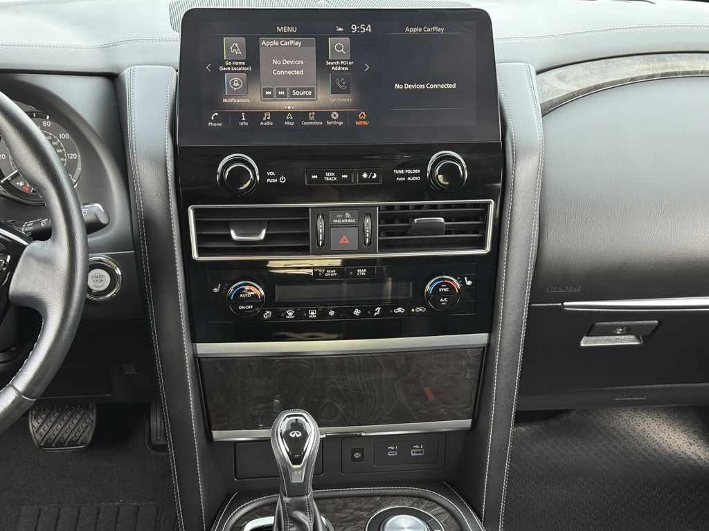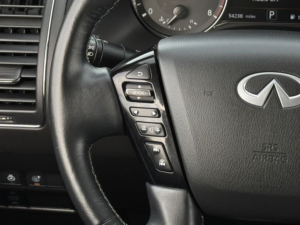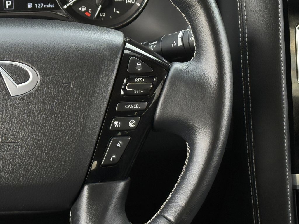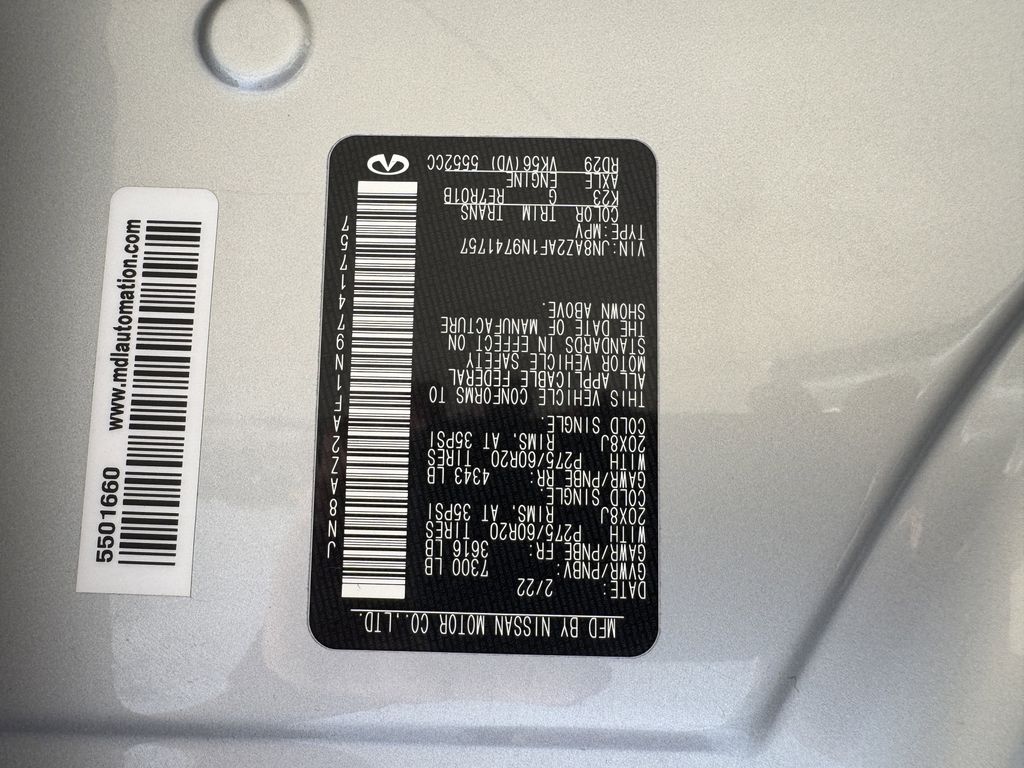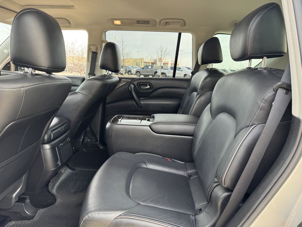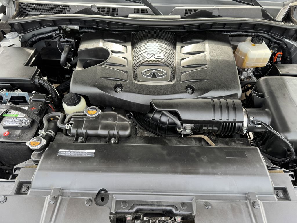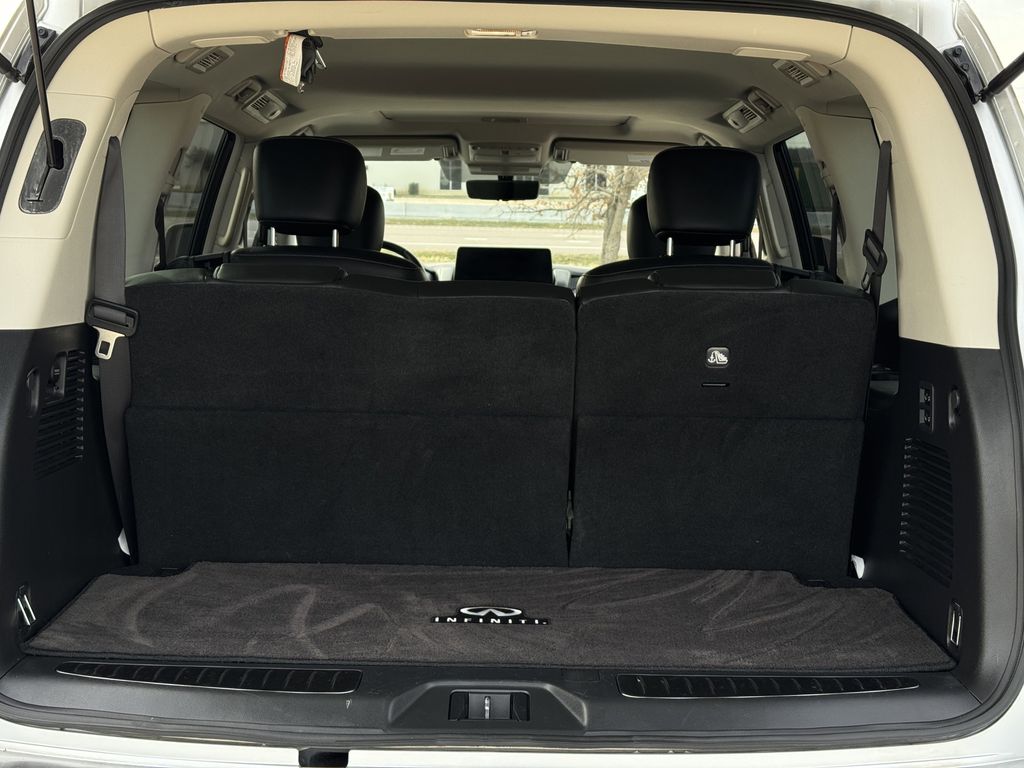 Clean CARFAX. Bluetooth, Hands-Free Connections, Navigation / GPS / Telematics, Portable Audio Connections, Premium Audio, 3rd Row Seats, Backup Camera, Heated and Cooled Seats, Leather Seats, Premium Wheels, High Performance Tires, Sunroof / Moonroof, Power Liftgate, Towing Package, QX80 LUXE, 4D Sport Utility, 5.6L V8, 7-Speed Automatic, RWD, Liquid Platinum, Graphite Leather, Cargo Package, Console Net, First-Aid Kit, High-Density Non-Slip Rear Cargo Carpet, Navigation system: INFINITI InTouch Navigation, Nylon-Cord Cargo Net, Power Liftgate, Power moonroof, Wheels: 20" x 8.0" Aluminum-Alloy.